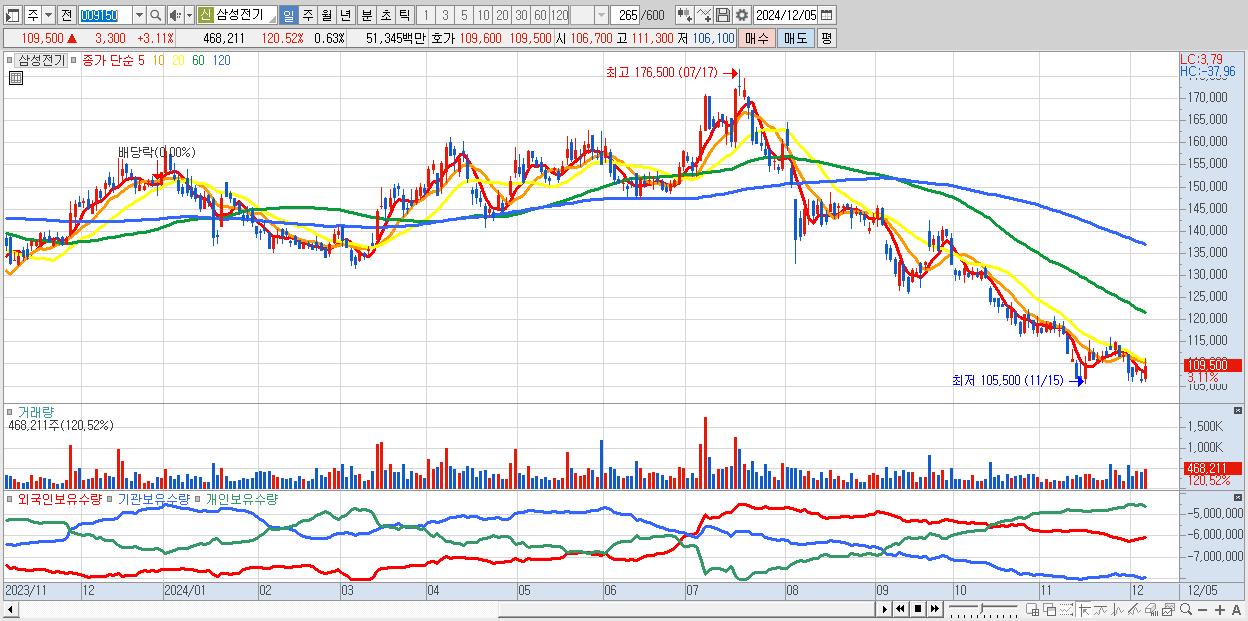 - 삼성전기 (109,500원 ▲ 3.11% , 시총: 81,790억, 외국인 순매수 거래금:88억)