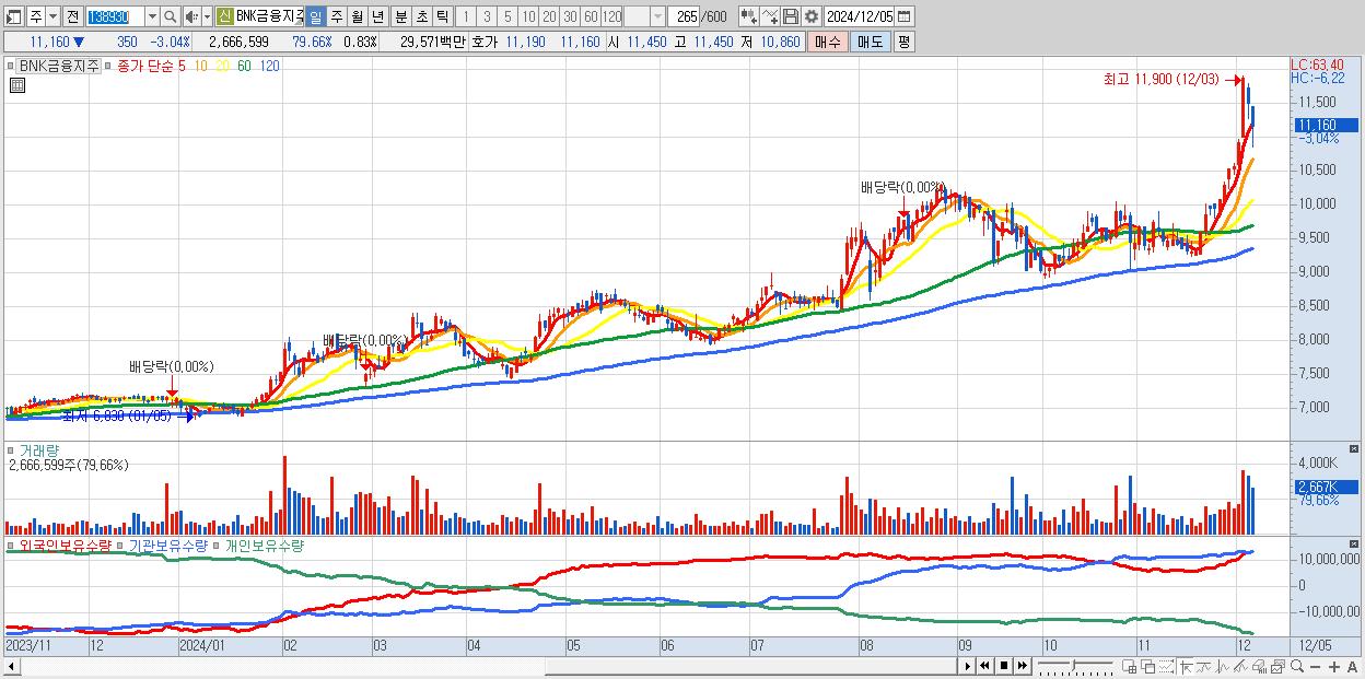 - BNK금융지주 (11,160원 ▼ -3.04% , 시총: 35,761억, 외국인 순매수 거래금:29억)