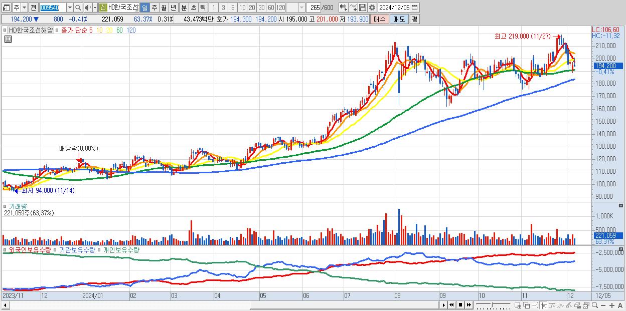 - HD한국조선해양 (194,200원 ▼ -0.41% , 시총: 137,441억, 외국인 순매수 거래금:44억)