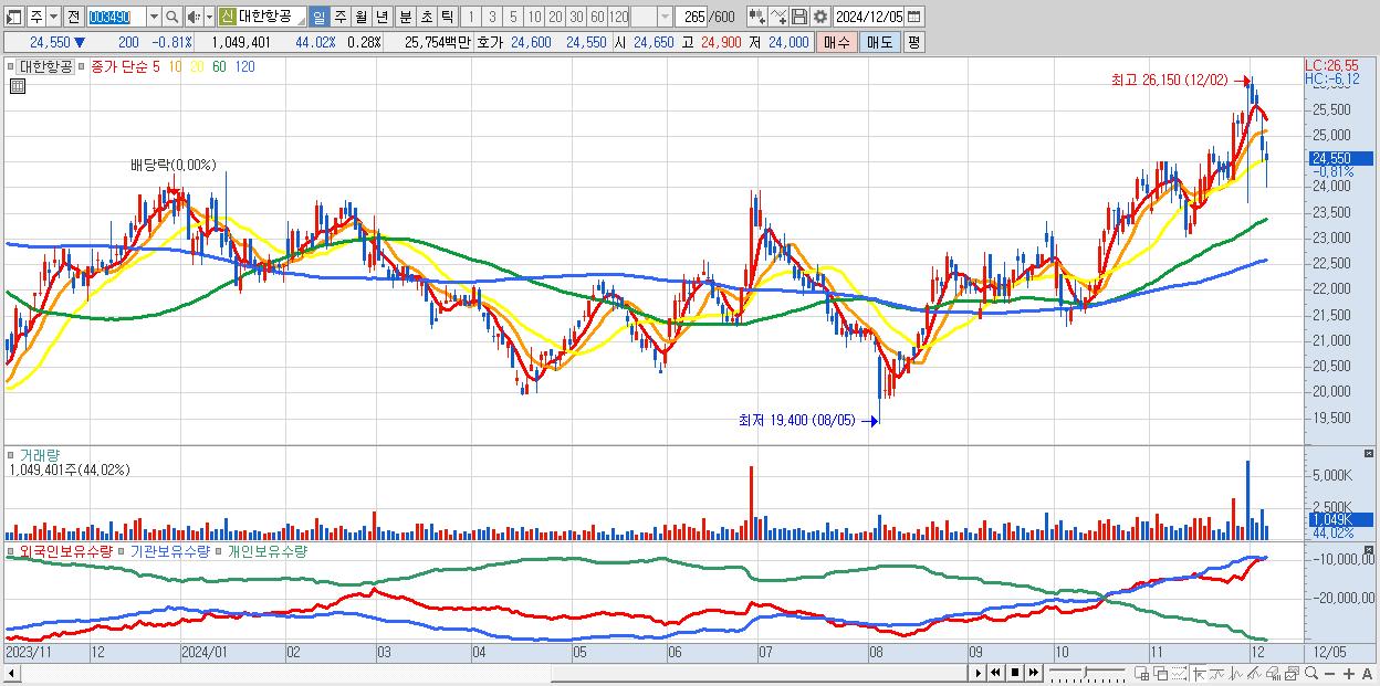 - 대한항공 (24,550원 ▼ -0.81% , 시총: 90,398억, 외국인 순매수 거래금:45억)
