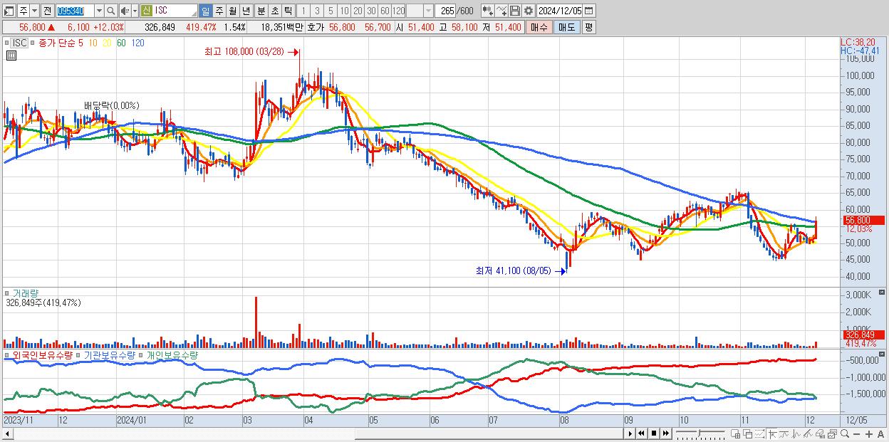 - ISC (56,800원 ▲ 12.03% , 시총: 12,040억, 외국인 순매수 거래금:30억)