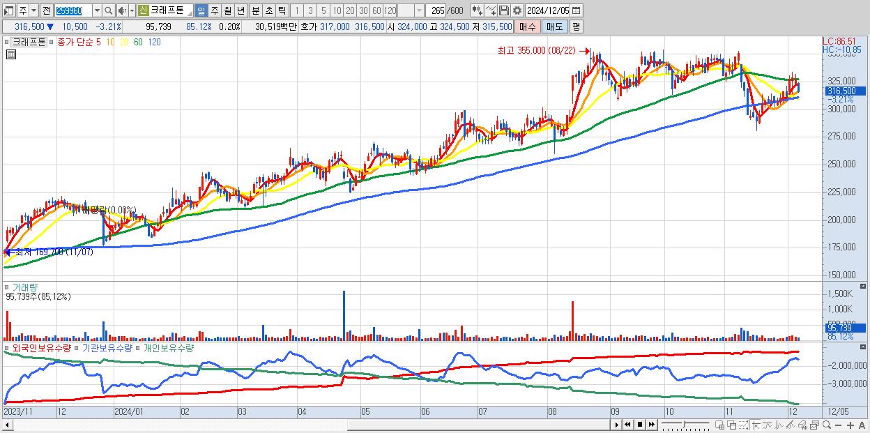 - 크래프톤 (316,500원 ▼ -3.21% , 시총: 151,605억, 외국인 순매수 거래금:65억)
