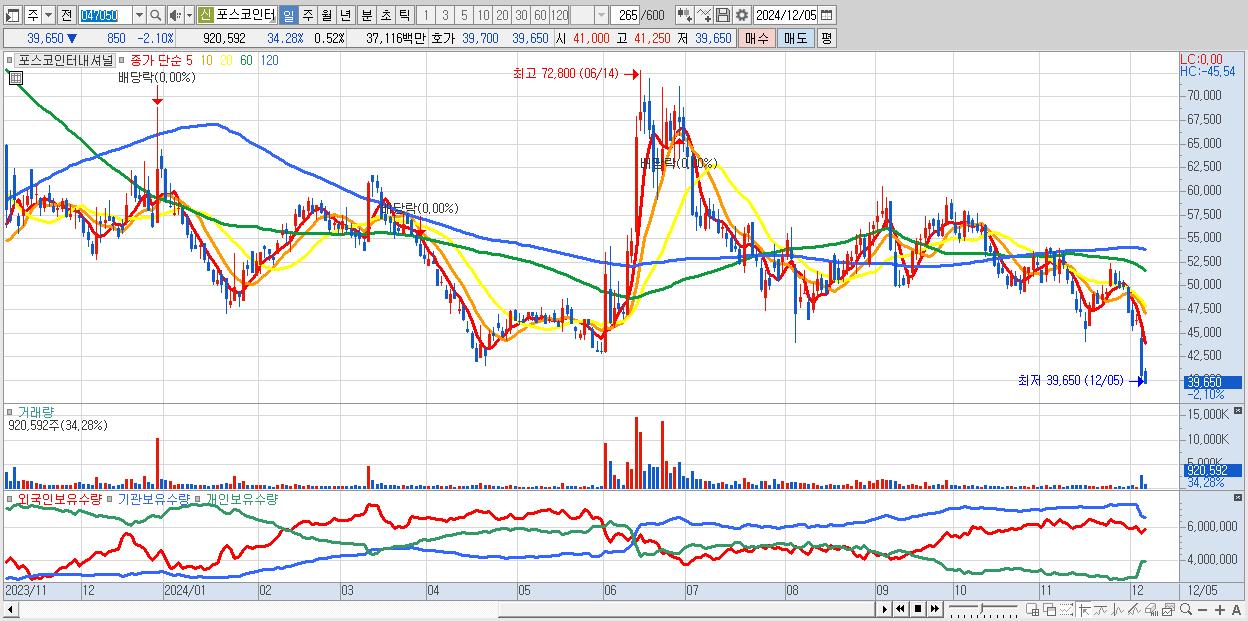 - 포스코인터내셔널 (39,650원 ▼ -2.1% , 시총: 69,753억, 외국인 순매수 거래금:28억)