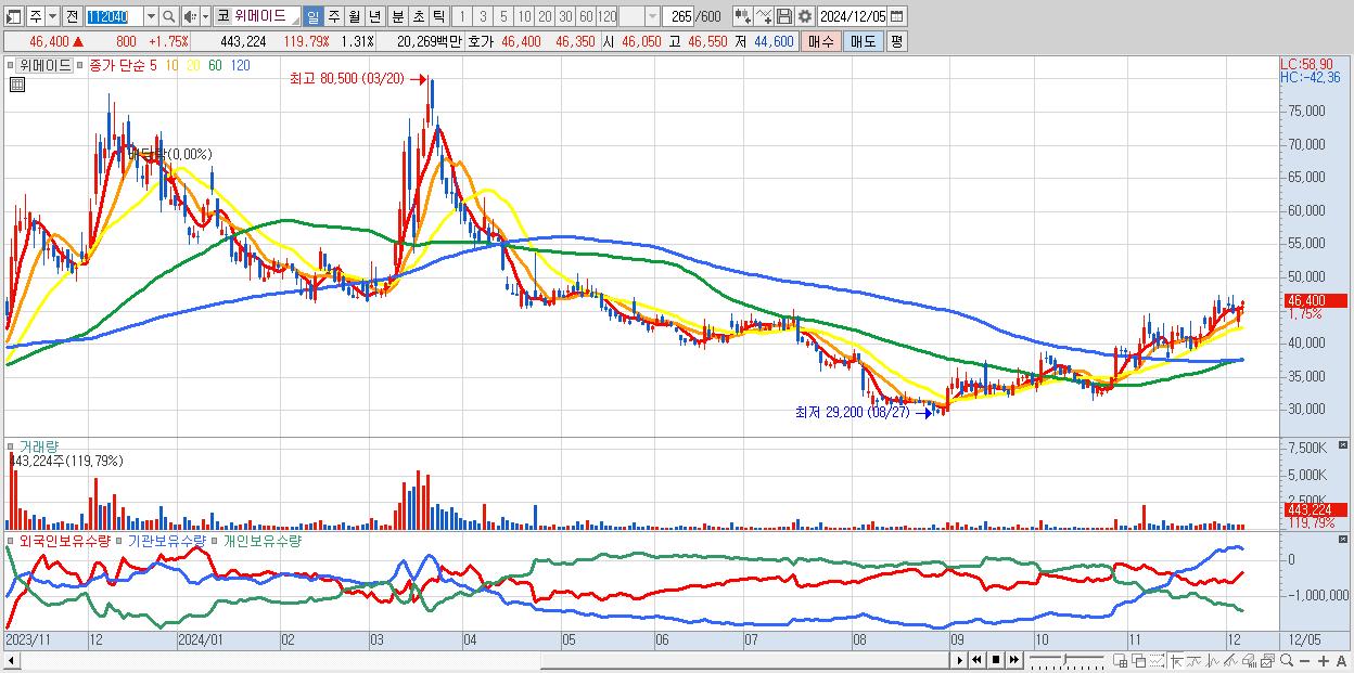 - 위메이드 (46,400원 ▲ 1.75% , 시총: 15,752억, 외국인 순매수 거래금:31억)
