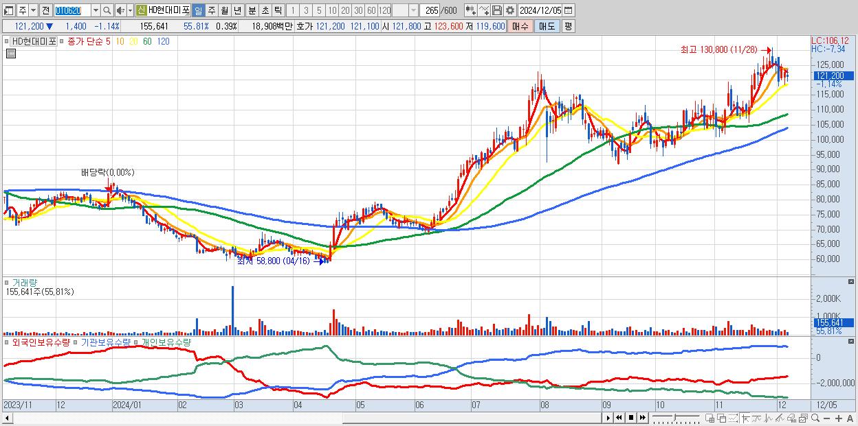- HD현대미포 (121,200원 ▼ -1.14% , 시총: 48,410억, 외국인 순매수 거래금:26억)