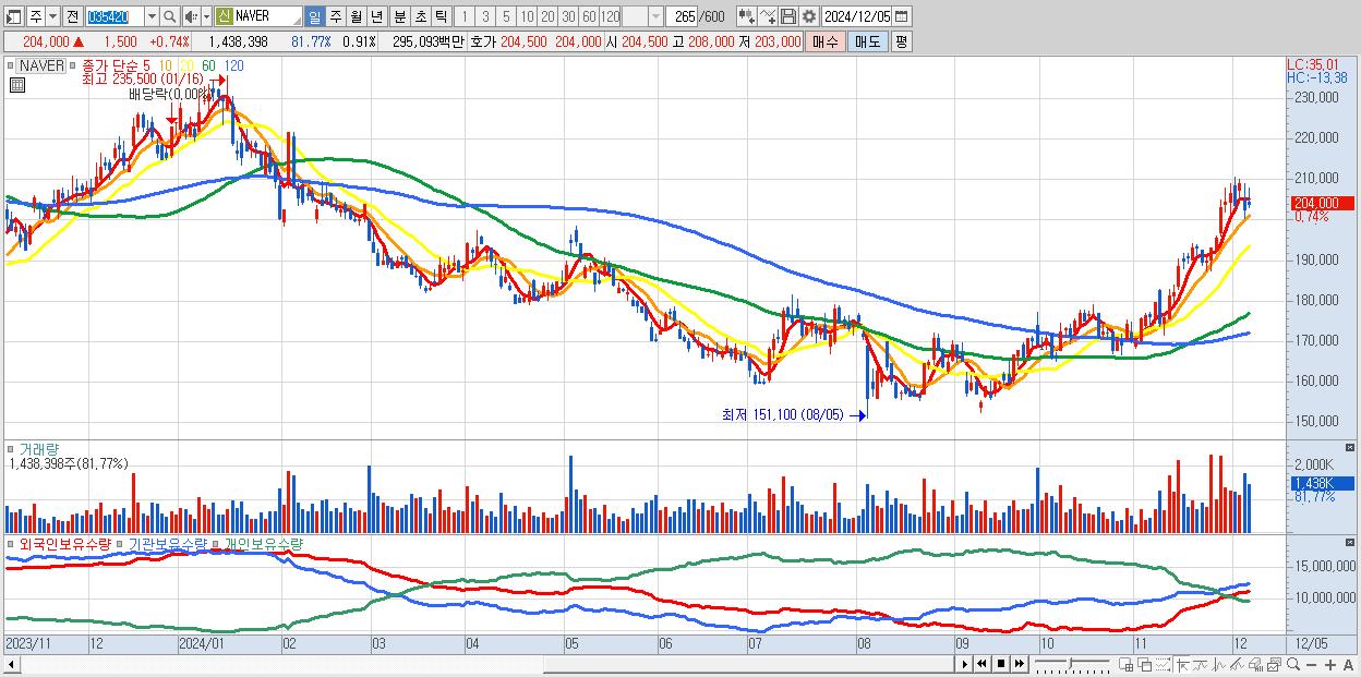 - NAVER (204,000원 ▲ 0.74% , 시총: 323,211억, 외국인 순매수 거래금:124억)