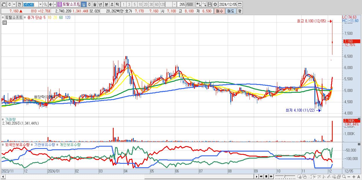 - 토탈소프트 (7,160원 ▲ 12.76% , 시총: 613억, 거래량: 2,740,209, 거래대금:203억, KOSDAQ)