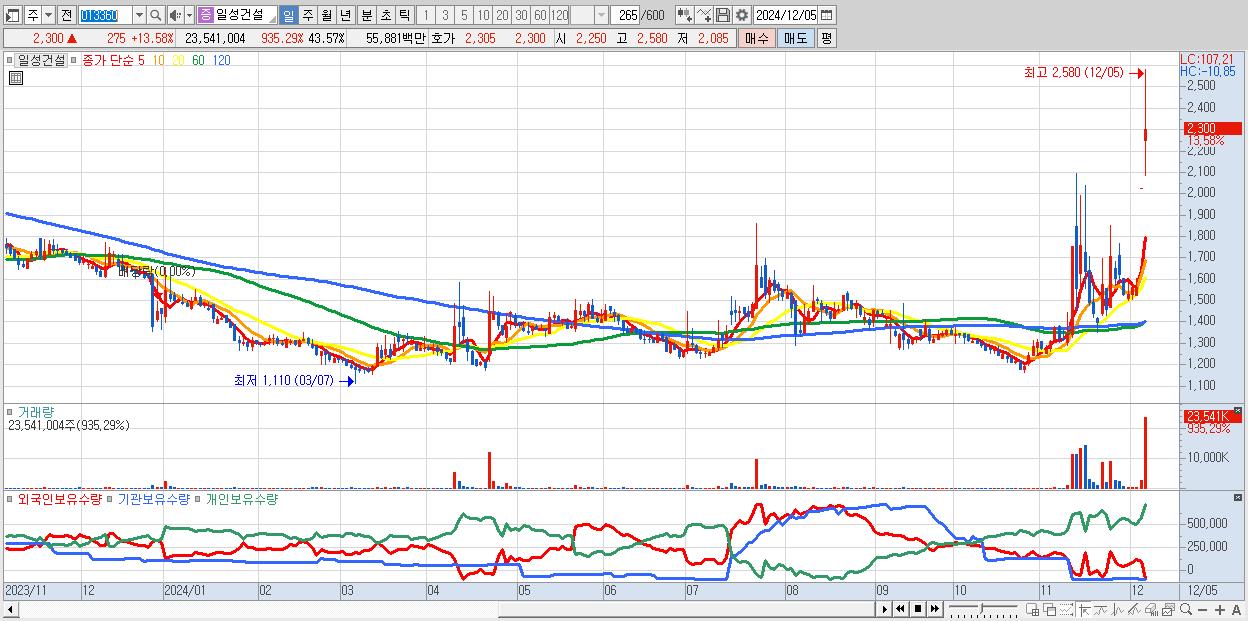- 일성건설 (2,300원 ▲ 13.58% , 시총: 1,243억, 거래량: 23,541,004, 거래대금:559억, KOSPI)