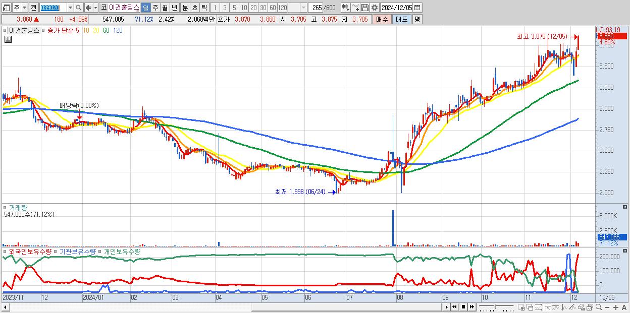 - 이건홀딩스 (3,860원 ▲ 4.89% , 시총: 872억, 거래량: 547,085, 거래대금:21억, KOSDAQ)