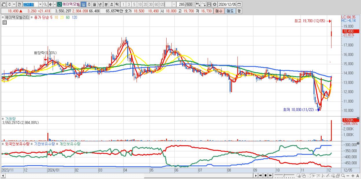 에이텍모빌리티 18,490원 ▲ 21.41% (KOSDAQ, 224110)