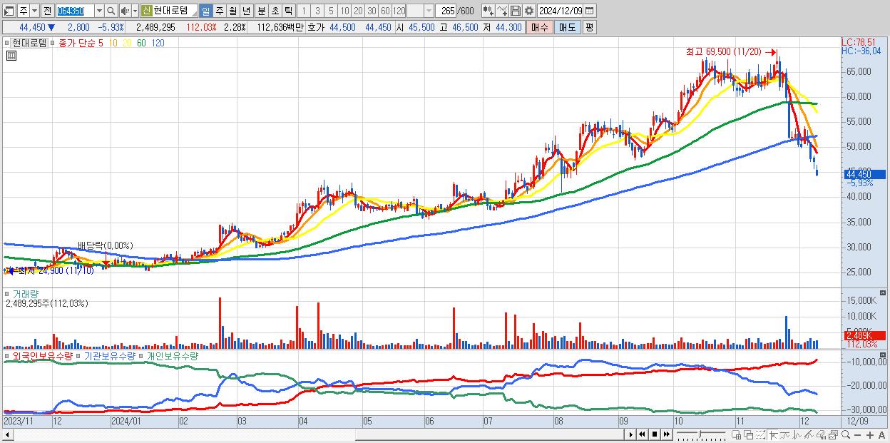 - 현대로템 (44,450원 ▼ -5.93% , 시총: 48,514억, 외국인 순매수 거래금:401억)