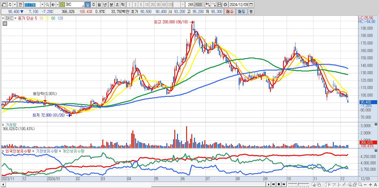 - SKC (90,400원 ▼ -7.28% , 시총: 34,233억, 외국인 순매수 거래금:82억)