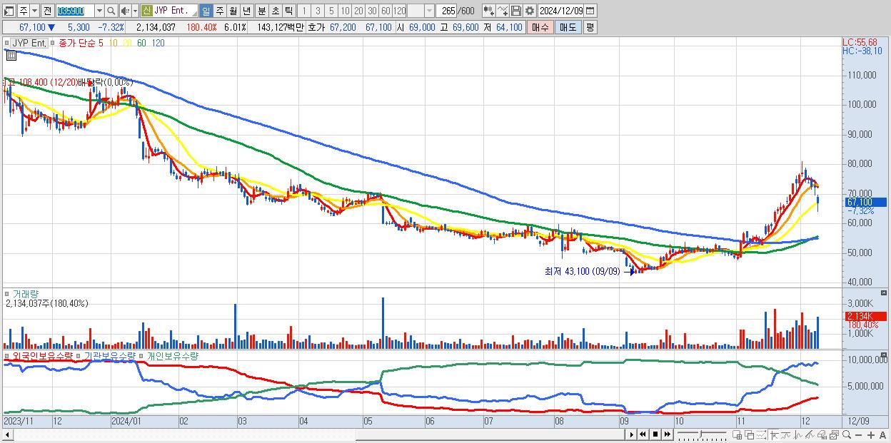 - JYP Ent. (67,100원 ▼ -7.32% , 시총: 23,842억, 외국인 순매수 거래금:159억)