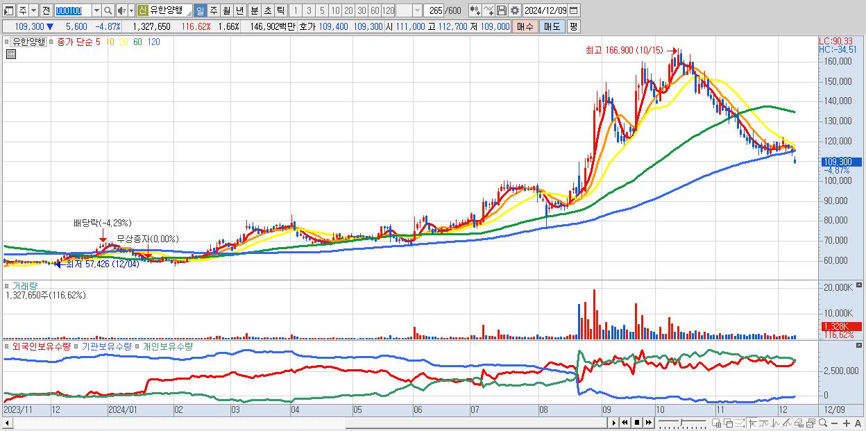 - 유한양행 (109,300원 ▼ -4.87% , 시총: 87,669억, 외국인 순매수 거래금:306억)