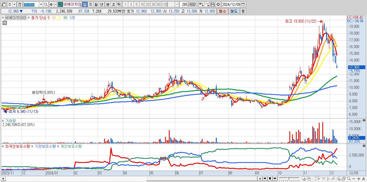 - 비에이치아이 (12,960원 ▼ -5.19% , 시총: 4,010억, 외국인 순매수 거래금:63억)
