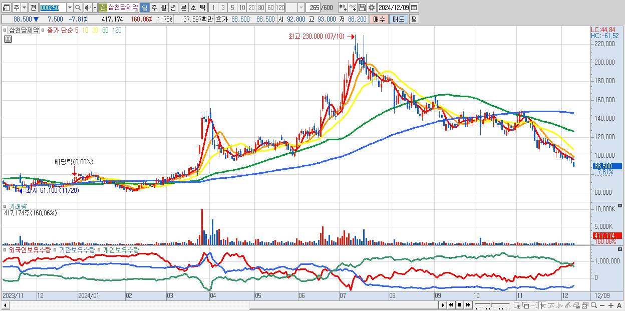 - 삼천당제약 (88,500원 ▼ -7.81% , 시총: 20,760억, 외국인 순매수 거래금:86억)