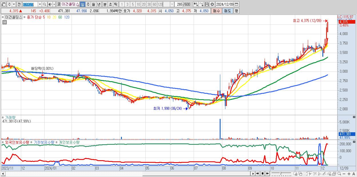 - 이건홀딩스 (4,315원 ▲ 3.48% , 시총: 975억, 거래량: 471,381, 거래대금:20억, KOSDAQ)