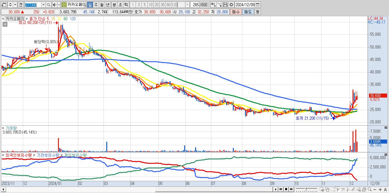 - 카카오페이 (30,600원 ▲ 0.82% , 시총: 41,195억, 거래량: 3,683,795, 거래대금:1,136억)