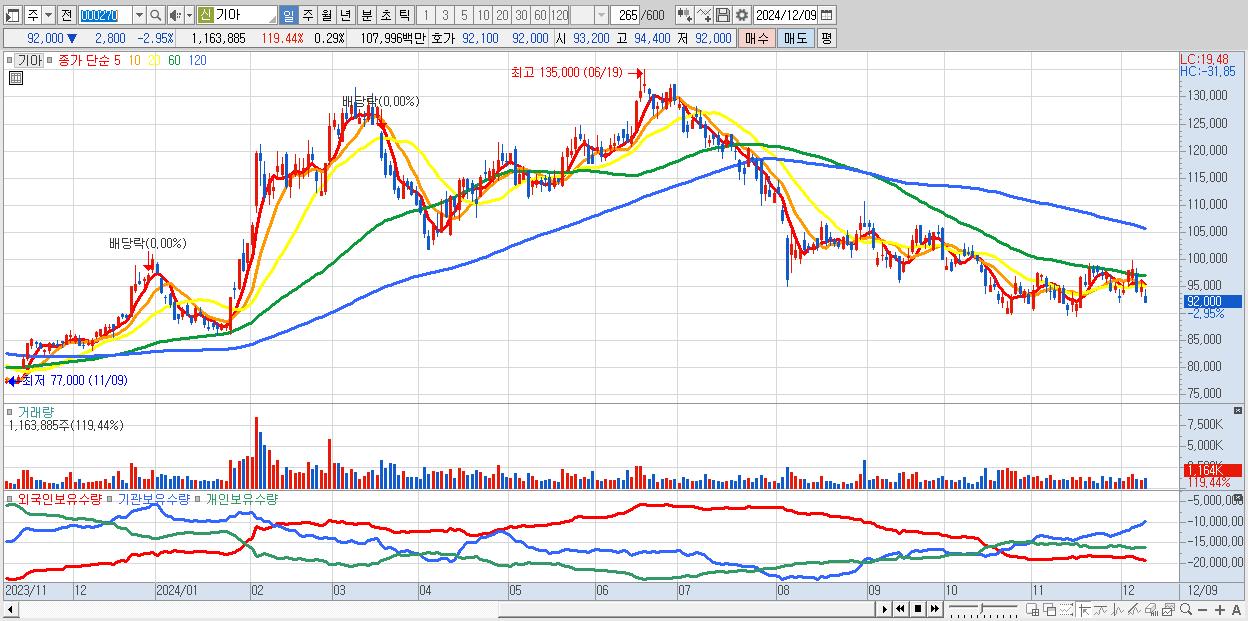 - 기아 (92,000원 ▼ -2.95% , 시총: 365,859억, 거래량: 1,163,885, 거래대금:1,080억)
