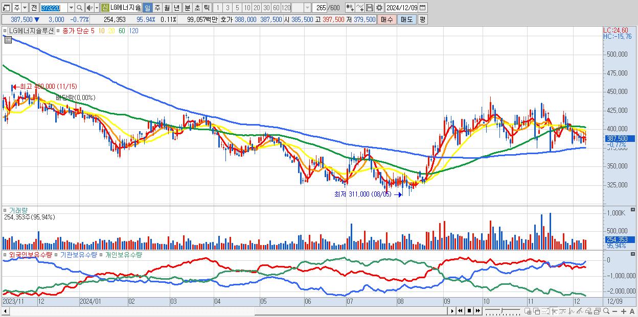 - LG에너지솔루션 (387,500원 ▼ -0.77% , 시총: 906,750억, 거래량: 254,353, 거래대금:991억)
