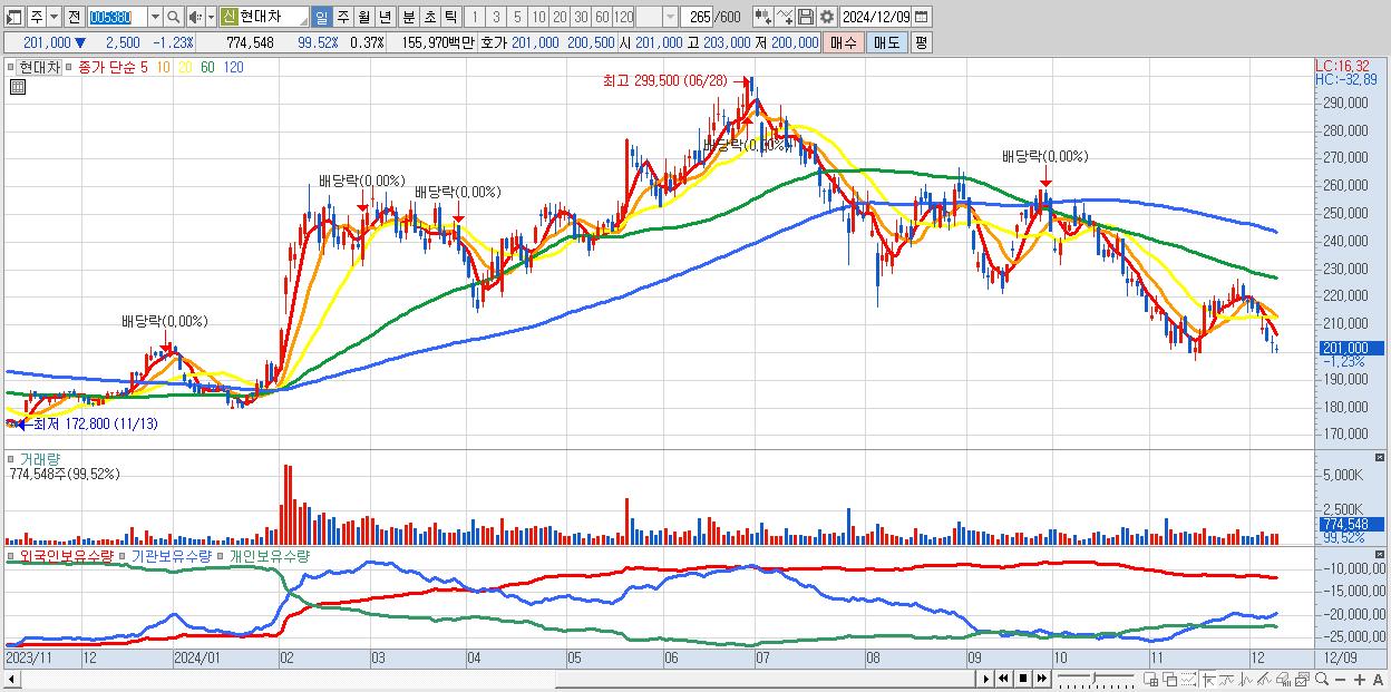 - 현대차 (201,000원 ▼ -1.23% , 시총: 420,927억, 거래량: 774,548, 거래대금:1,560억)