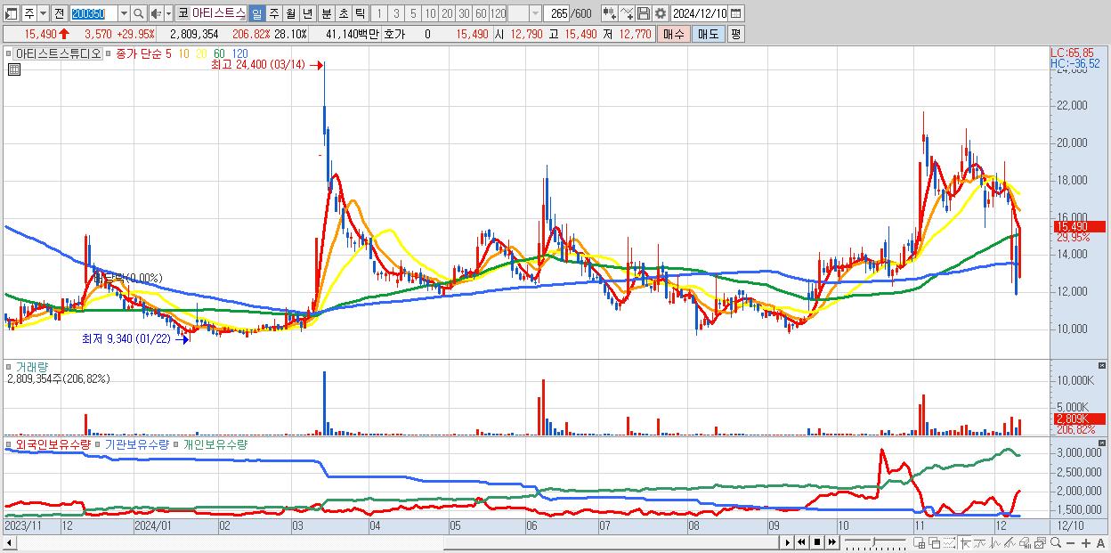 - 아티스트스튜디오 (15,490원 ▲ 29.95% , 시총: 1,548억, 거래량: 2,809,354, 거래대금:411억)