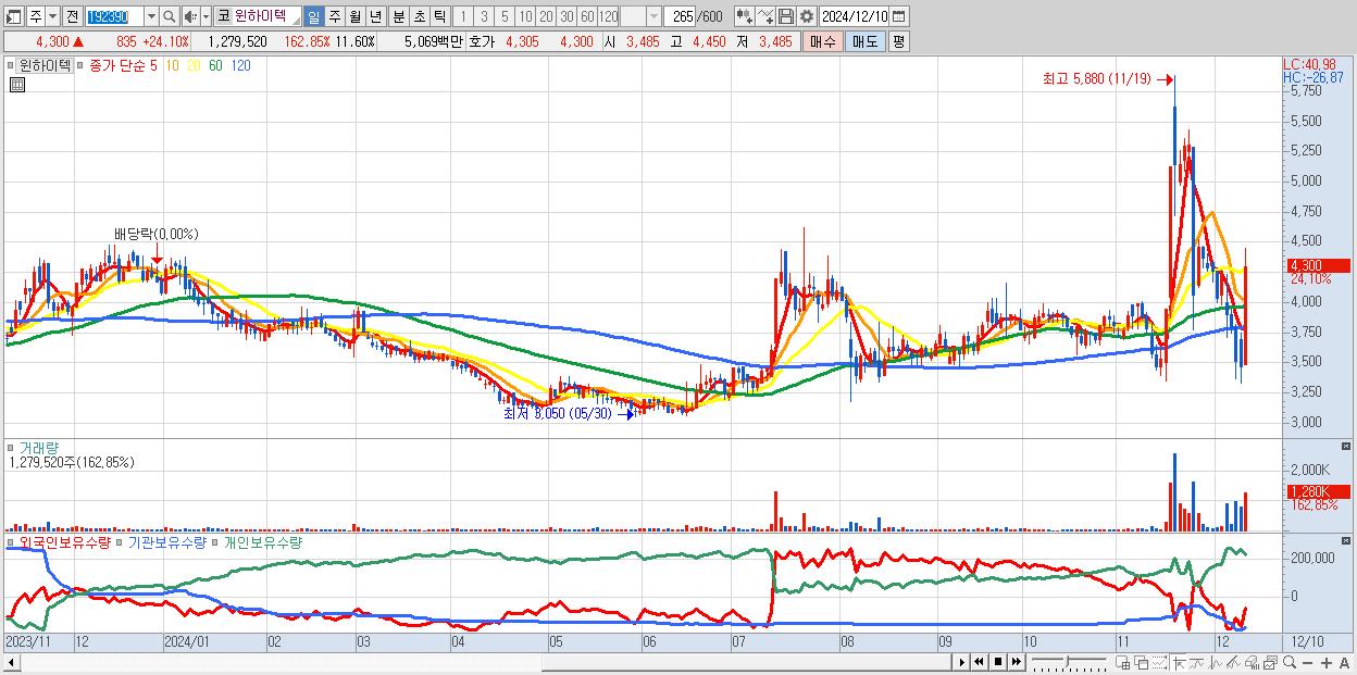 - 윈하이텍 (4,300원 ▲ 24.1% , 시총: 474억, 거래량: 1,279,520, 거래대금:51억)
