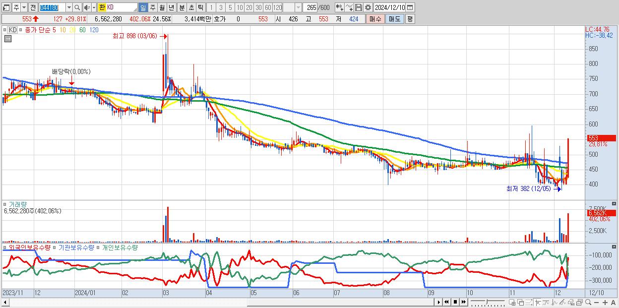 - KD (553원 ▲ 29.81% , 시총: 148억, 거래량: 6,562,280, 거래대금:34억)