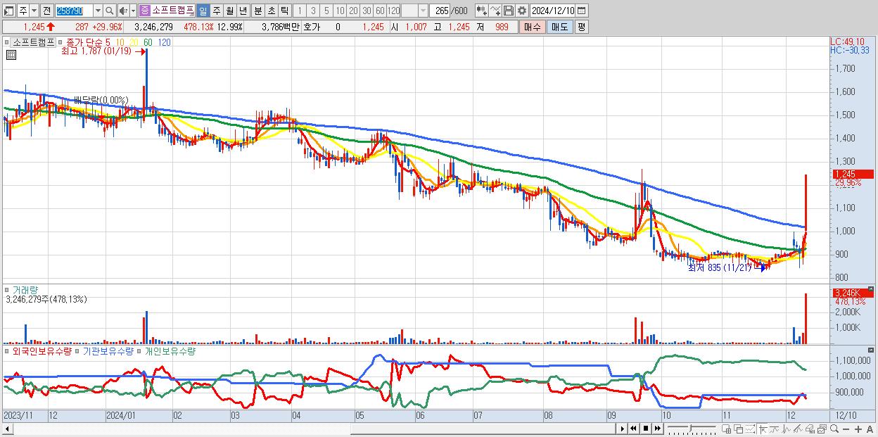 - 소프트캠프 (1,245원 ▲ 29.96% , 시총: 311억, 거래량: 3,246,279, 거래대금:38억)