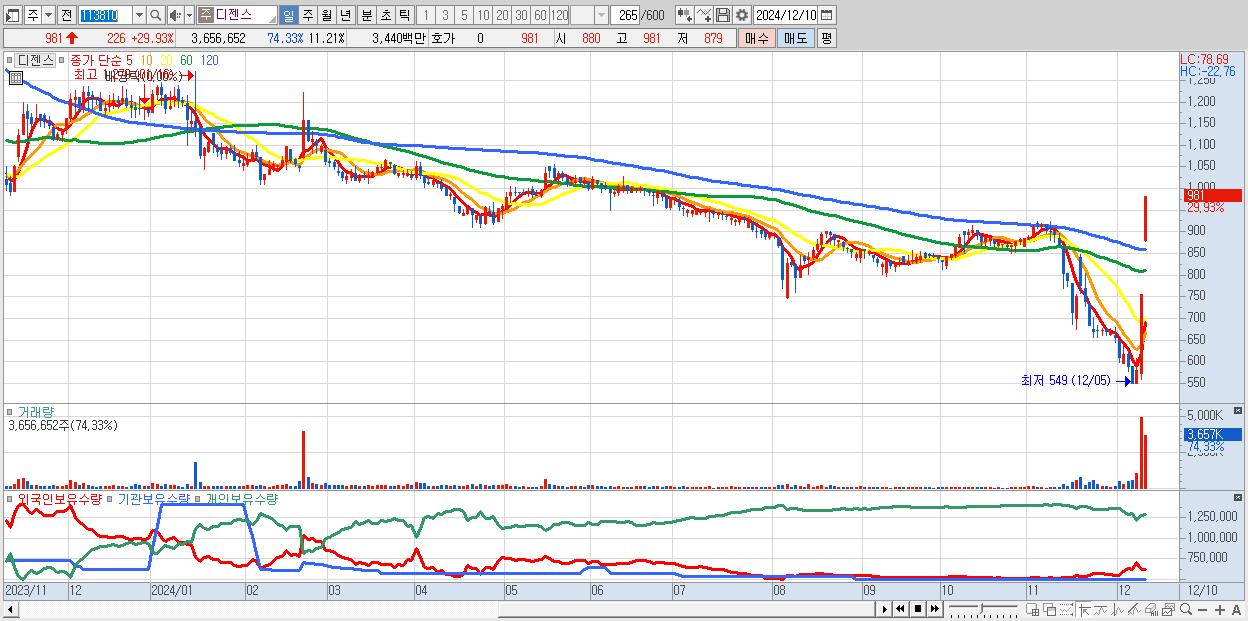 - 디젠스 (981원 ▲ 29.93% , 시총: 320억, 거래량: 3,656,652, 거래대금:34억)