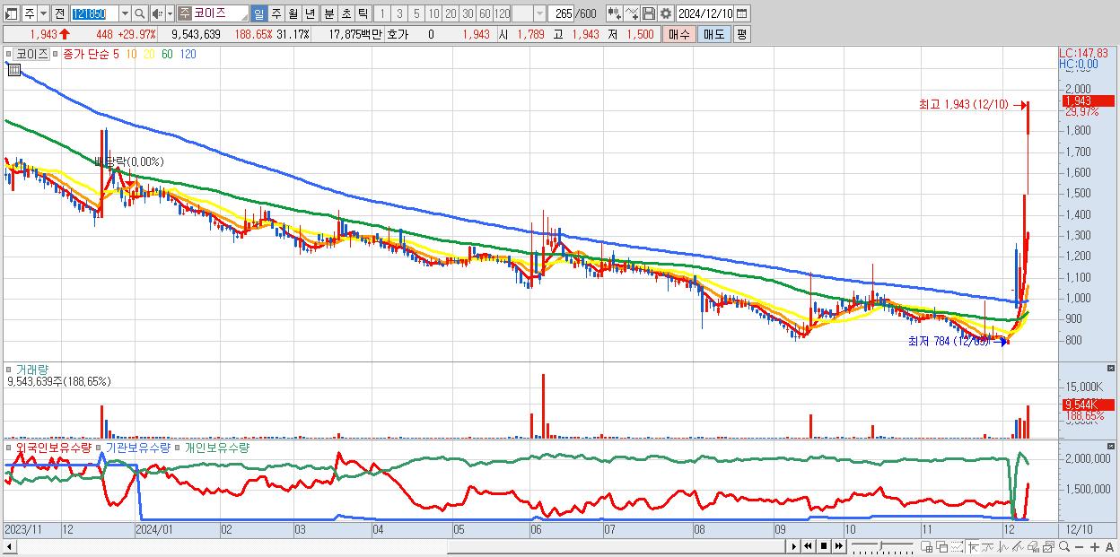 - 코이즈 (1,943원 ▲ 29.97% , 시총: 595억, 거래량: 9,543,639, 거래대금:179억)