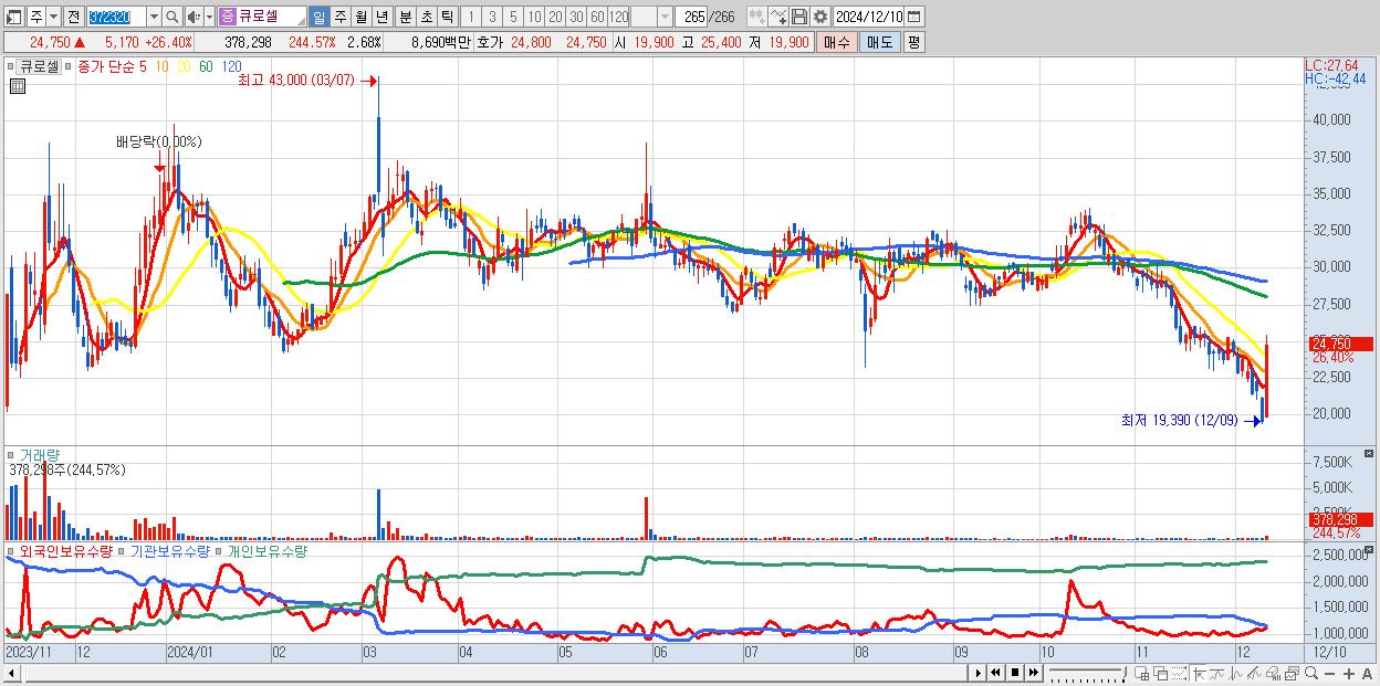 - 큐로셀 (24,750원 ▲ 26.4% , 시총: 3,493억, 거래량: 378,298, 거래대금:87억)