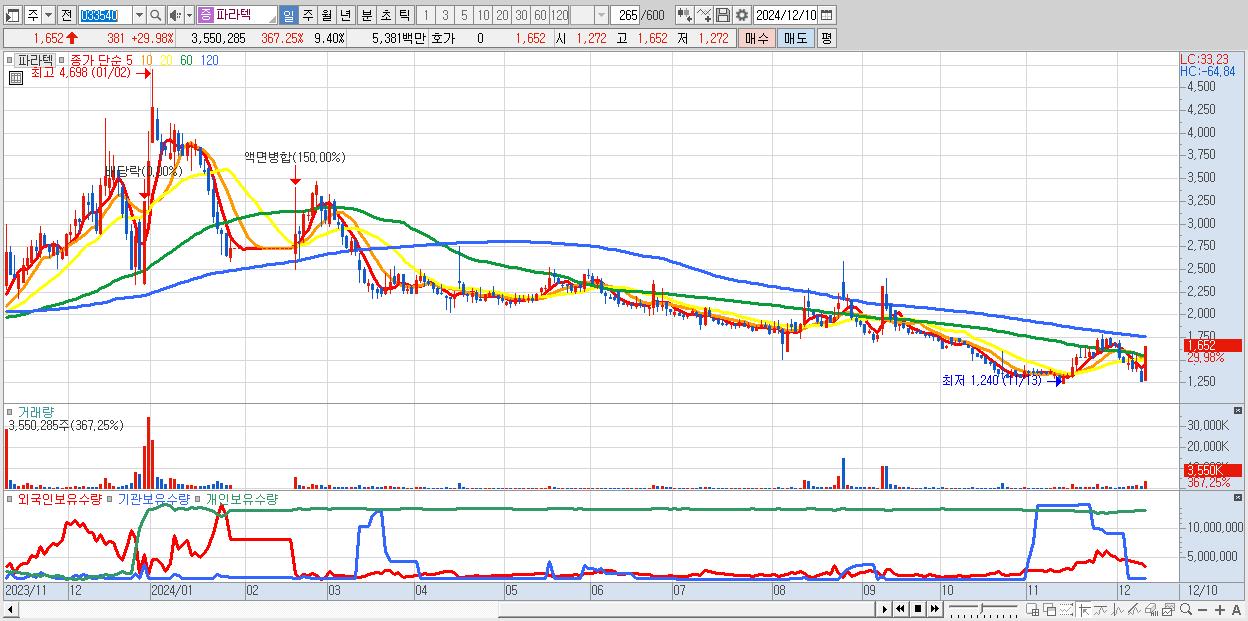 - 파라텍 (1,652원 ▲ 29.98% , 시총: 624억, 거래량: 3,550,285, 거래대금:54억)