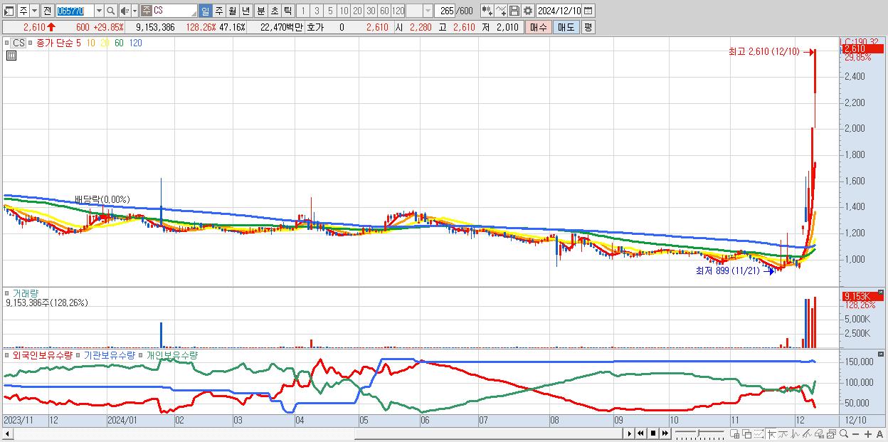 - CS (2,610원 ▲ 29.85% , 시총: 507억, 거래량: 9,153,386, 거래대금:225억)