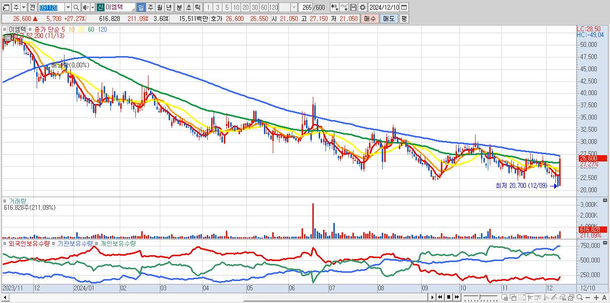- 이엠텍 (26,600원 ▲ 27.27% , 시총: 4,557억, 거래량: 616,828, 거래대금:155억)