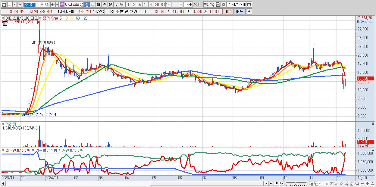 - 아티스트유나이티드 (13,320원 ▲ 29.95% , 시총: 1,780억, 거래량: 1,840,948, 거래대금:239억)