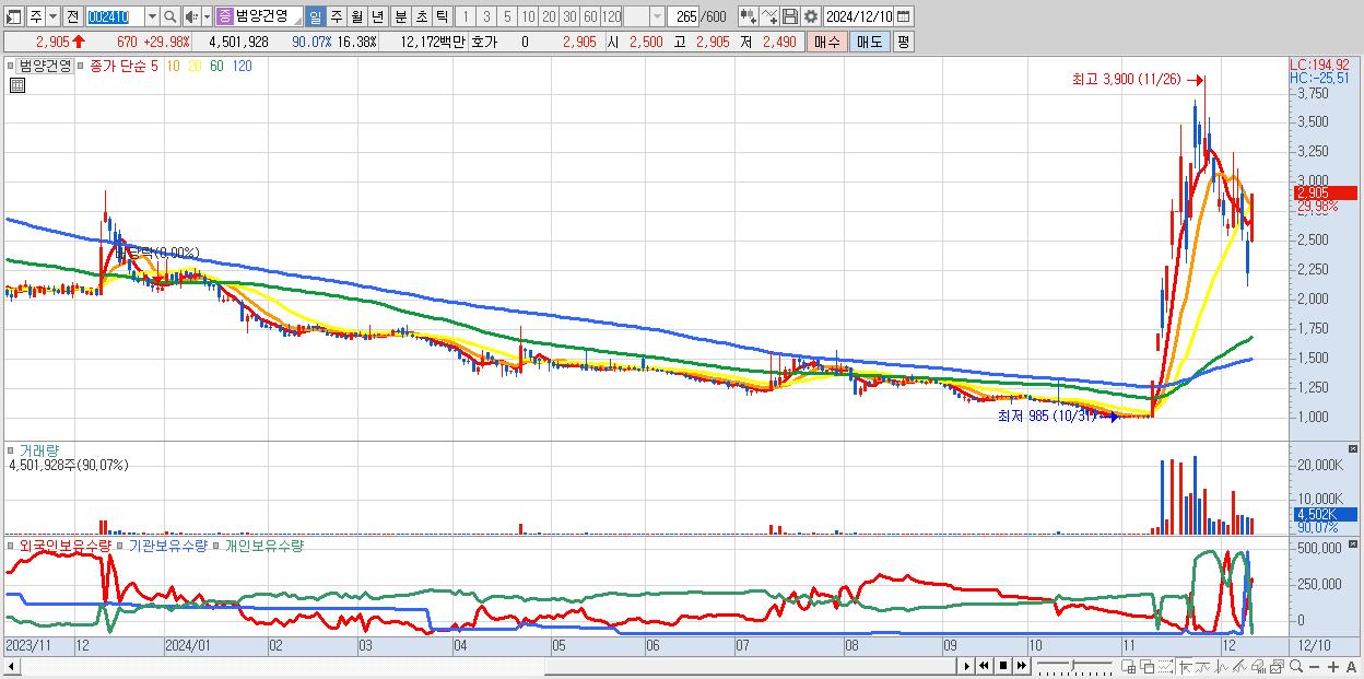 - 범양건영 (2,905원 ▲ 29.98% , 시총: 798억, 거래량: 4,501,928, 거래대금:122억)