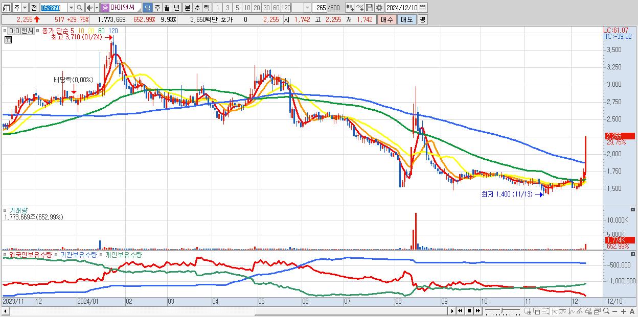 - 아이앤씨 (2,255원 ▲ 29.75% , 시총: 403억, 거래량: 1,773,669, 거래대금:36억)