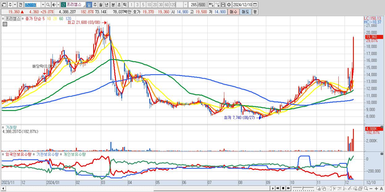 - 프리엠스 (19,360원 ▲ 29.07% , 시총: 1,162억, 거래량: 4,388,207, 거래대금:780억)