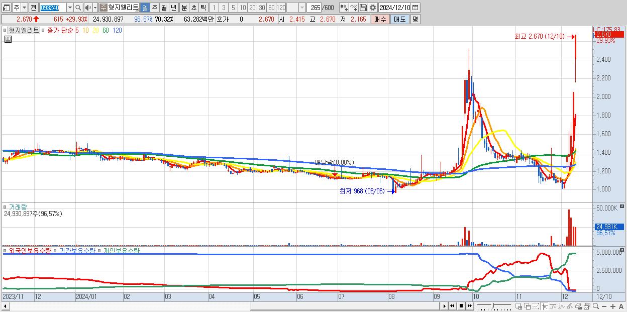 - 형지엘리트 (2,670원 ▲ 29.93% , 시총: 947억, 거래량: 24,930,897, 거래대금:633억)