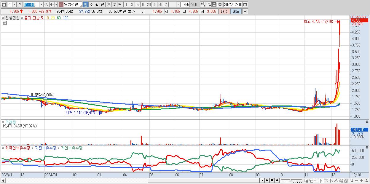 - 일성건설 (4,705원 ▲ 29.97% , 시총: 2,542억, 거래량: 19,471,042, 거래대금:865억)