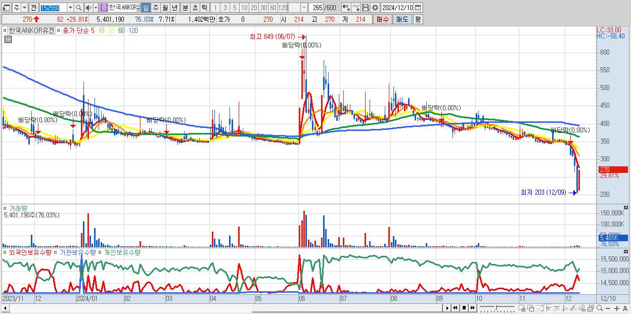 - 한국ANKOR유전 (270원 ▲ 29.81% , 시총: 189억, 거래량: 5,401,190, 거래대금:14억)