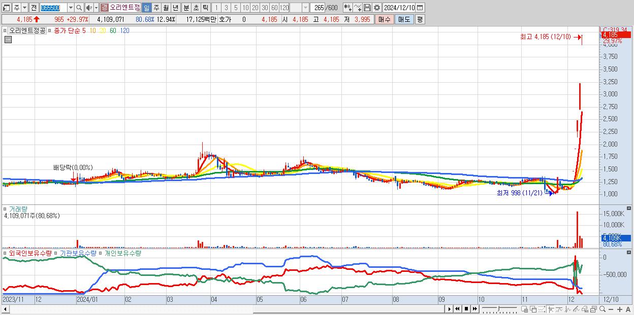 - 오리엔트정공 (4,185원 ▲ 29.97% , 시총: 1,328억, 거래량: 4,109,071, 거래대금:171억)
