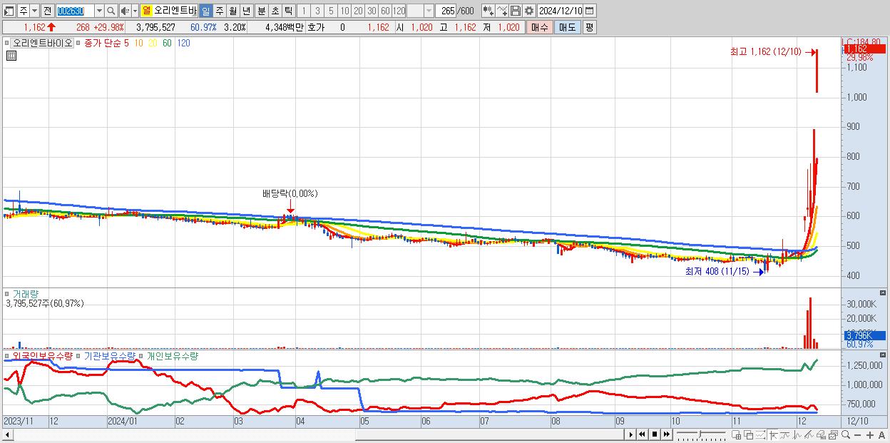 - 오리엔트바이오 (1,162원 ▲ 29.98% , 시총: 1,378억, 거래량: 3,795,527, 거래대금:43억)