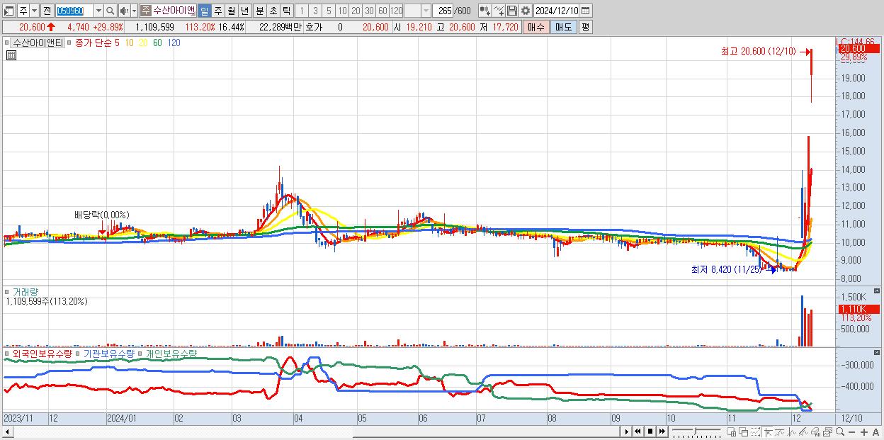 - 수산아이앤티 (20,600원 ▲ 29.89% , 시총: 1,391억, 거래량: 1,109,599, 거래대금:223억)