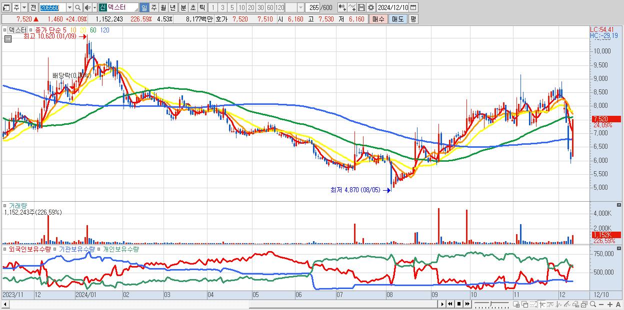 - 덱스터 (7,520원 ▲ 24.09% , 시총: 1,911억, 거래량: 1,152,243, 거래대금:82억)