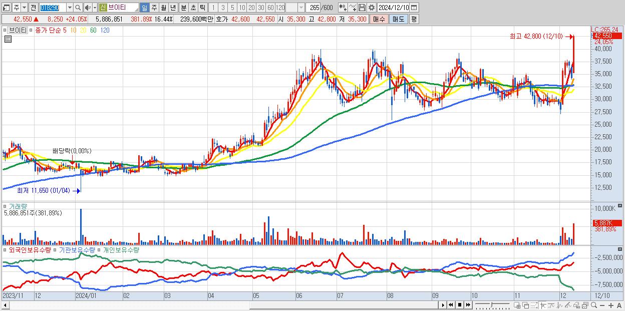 - 브이티 (42,550원 ▲ 24.05% , 시총: 15,232억, 거래량: 5,886,851, 거래대금:2,396억)