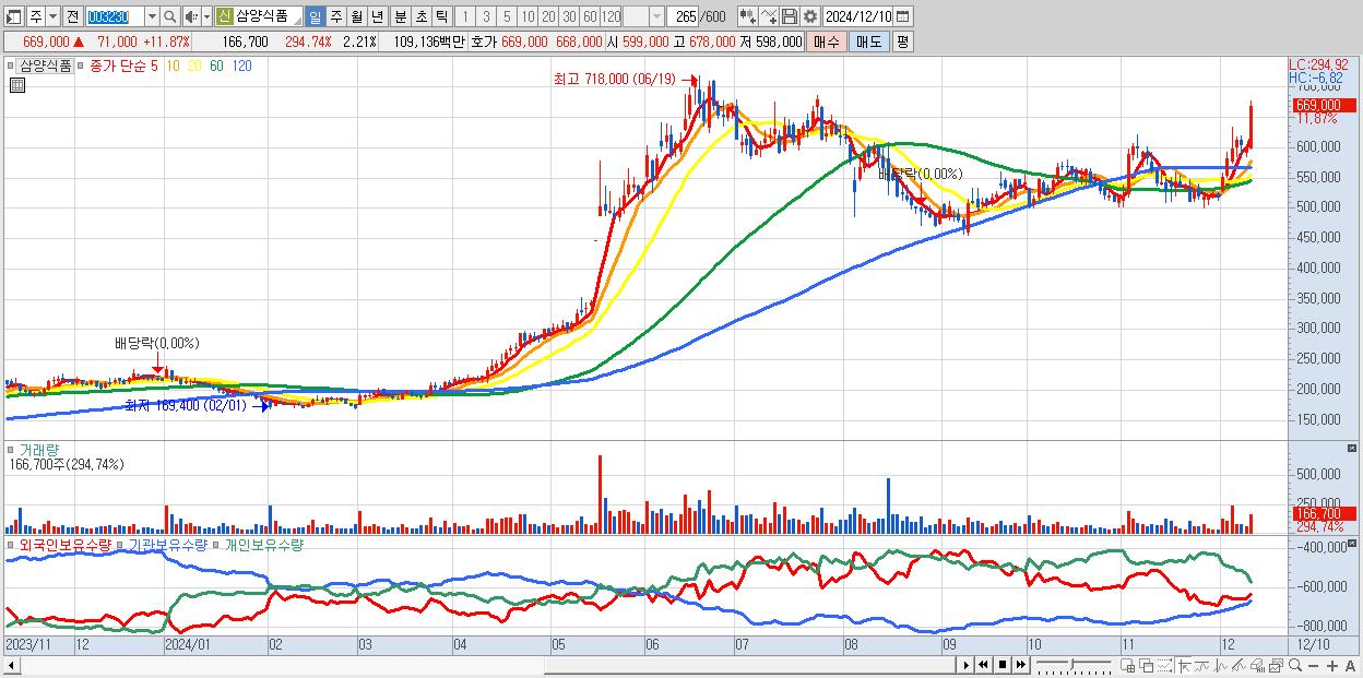 - 삼양식품 (669,000원 ▲ 11.87% , 시총: 50,396억, 외국인 순매수 거래금:110억)