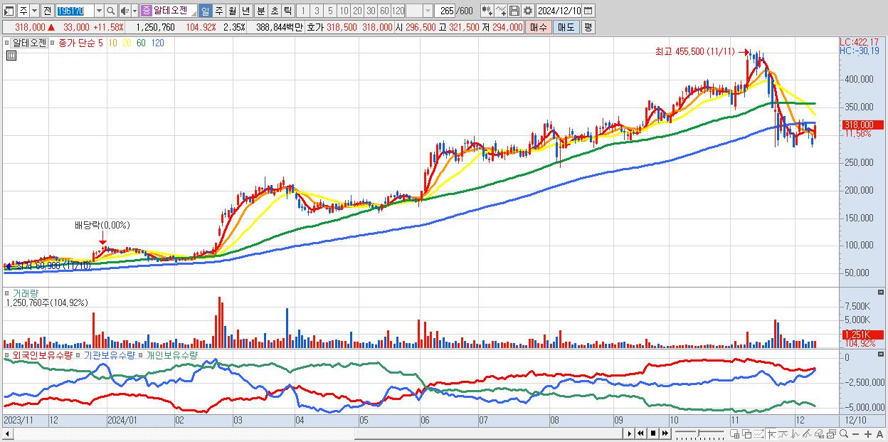 - 알테오젠 (318,000원 ▲ 11.58% , 시총: 169,554억, 외국인 순매수 거래금:166억)