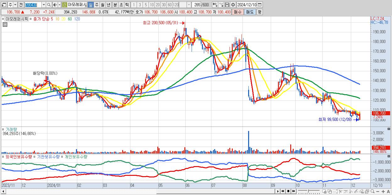 - 아모레퍼시픽 (106,700원 ▲ 7.24% , 시총: 62,412억, 외국인 순매수 거래금:61억)